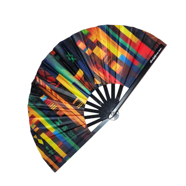 Stay cool and stylish with the African Print Clack Fan by Shady B Fans. Inspired by vibrant African designs, this large fan adds culture and charm to any look. It measures 20 inches wide when open and folds down to a compact 10 inches for easy carrying.