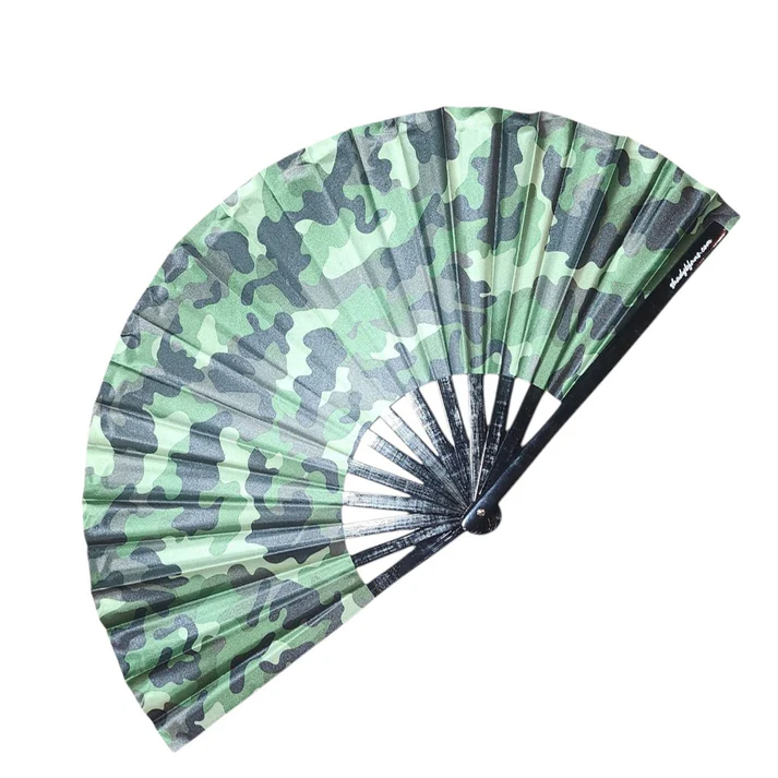 Made with sturdy bamboo ribs and smooth satin-like fabric, this fan is built to last through every event. The camouflage print adds a rugged yet stylish vibe—ideal for festivals, parties, and outdoor gatherings. Whether you’re cooling off or making a statement, the Camouflage Clack Fan keeps you shady and fierce.