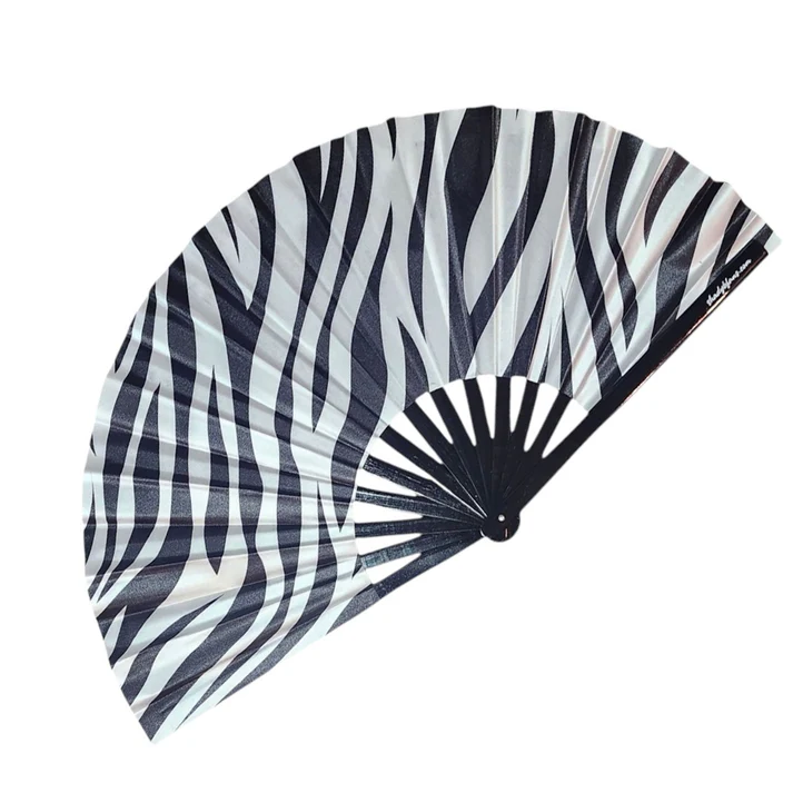 Unleash your wild side with the Zebra Print Clack Fan by Shady B Fans. This oversized 25-inch fan delivers the bold clack and striking style every trendsetter craves. Built with durable bamboo ribs and smooth satin-like fabric, it’s perfect for festivals, parties, or everyday flair. The black-and-white zebra print adds a fierce touch that commands attention anywhere you go.